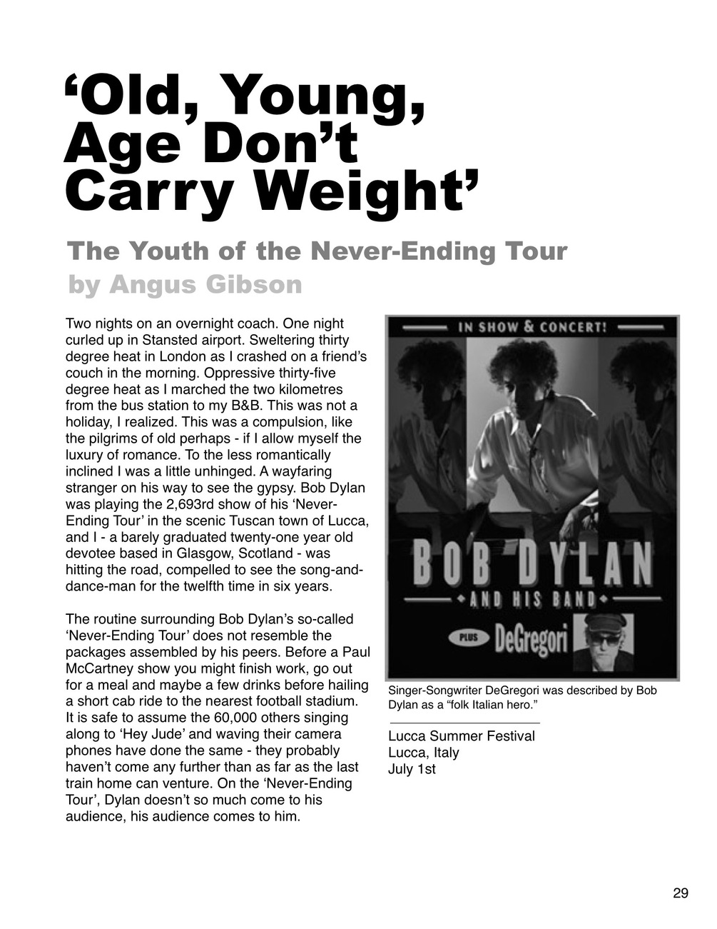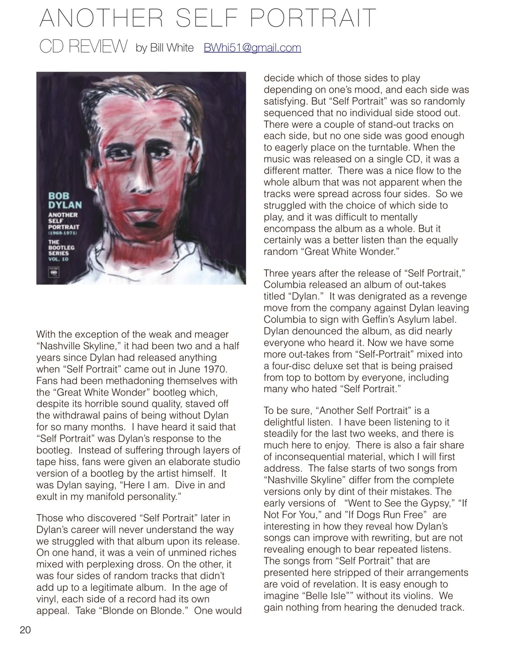 DYLAN is a Bob Dylan magazine which provides writing which covers a variety of topics, including recent news and delving into the vast catalogue of albums and bootlegs. This issue includes the articles Shadows In The Night, Secret of The Basement Tapes, Another Self Portrait Review, Musicares Speech, Andy Kaufman and Bob Dylan, and more.