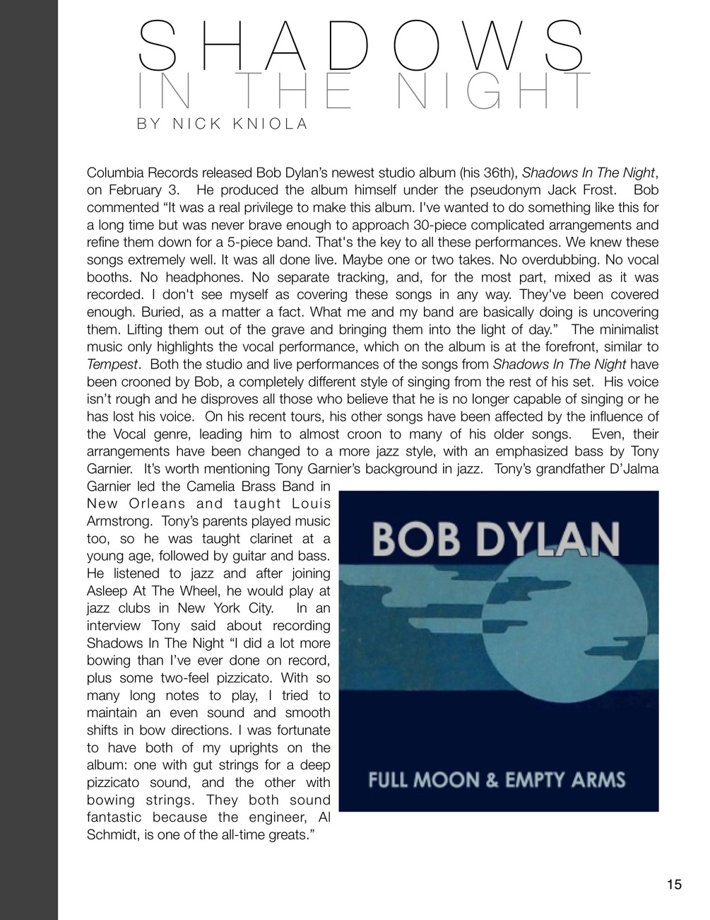 DYLAN is a Bob Dylan magazine which provides writing which covers a variety of topics, including recent news and delving into the vast catalogue of albums and bootlegs. This issue includes the articles Shadows In The Night, Secret of The Basement Tapes, Another Self Portrait Review, Musicares Speech, Andy Kaufman and Bob Dylan, and more.