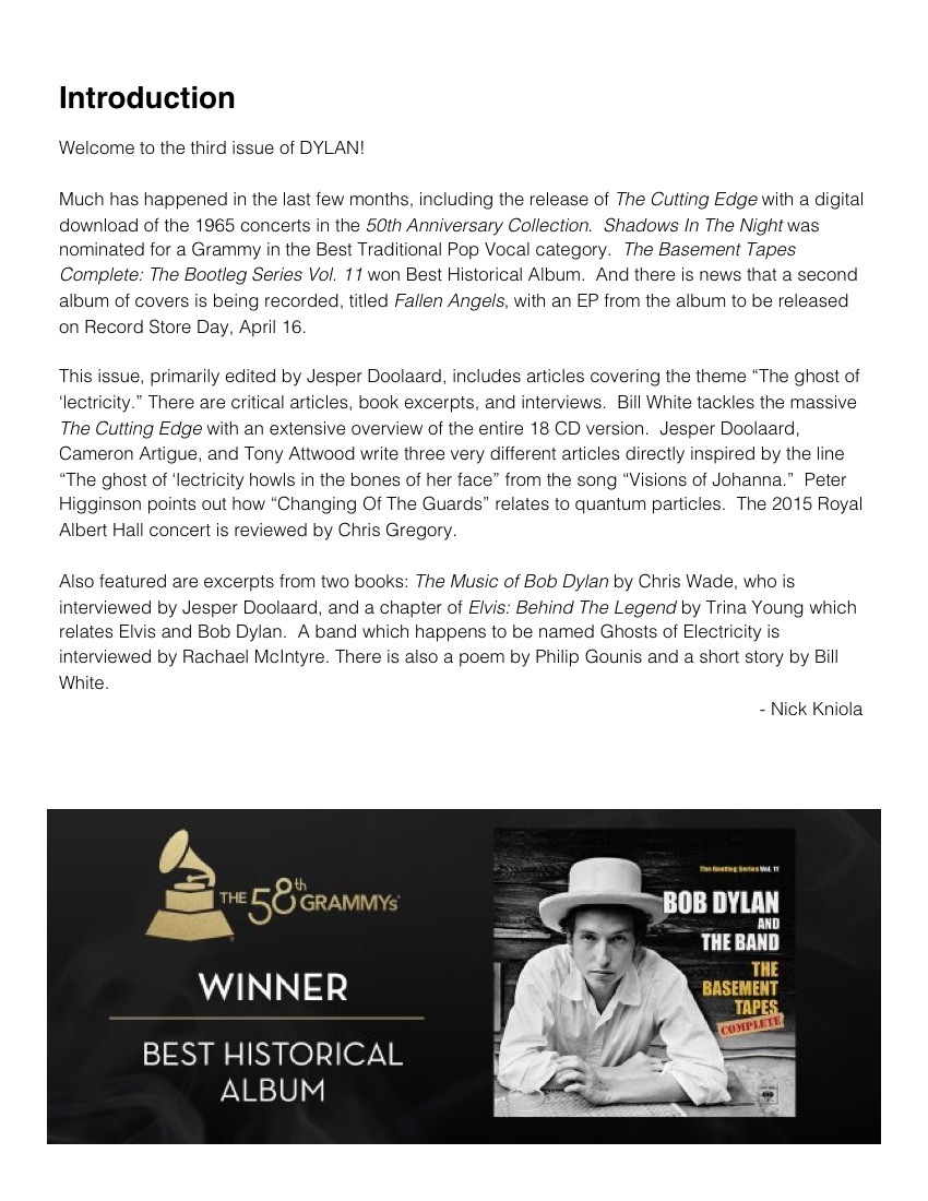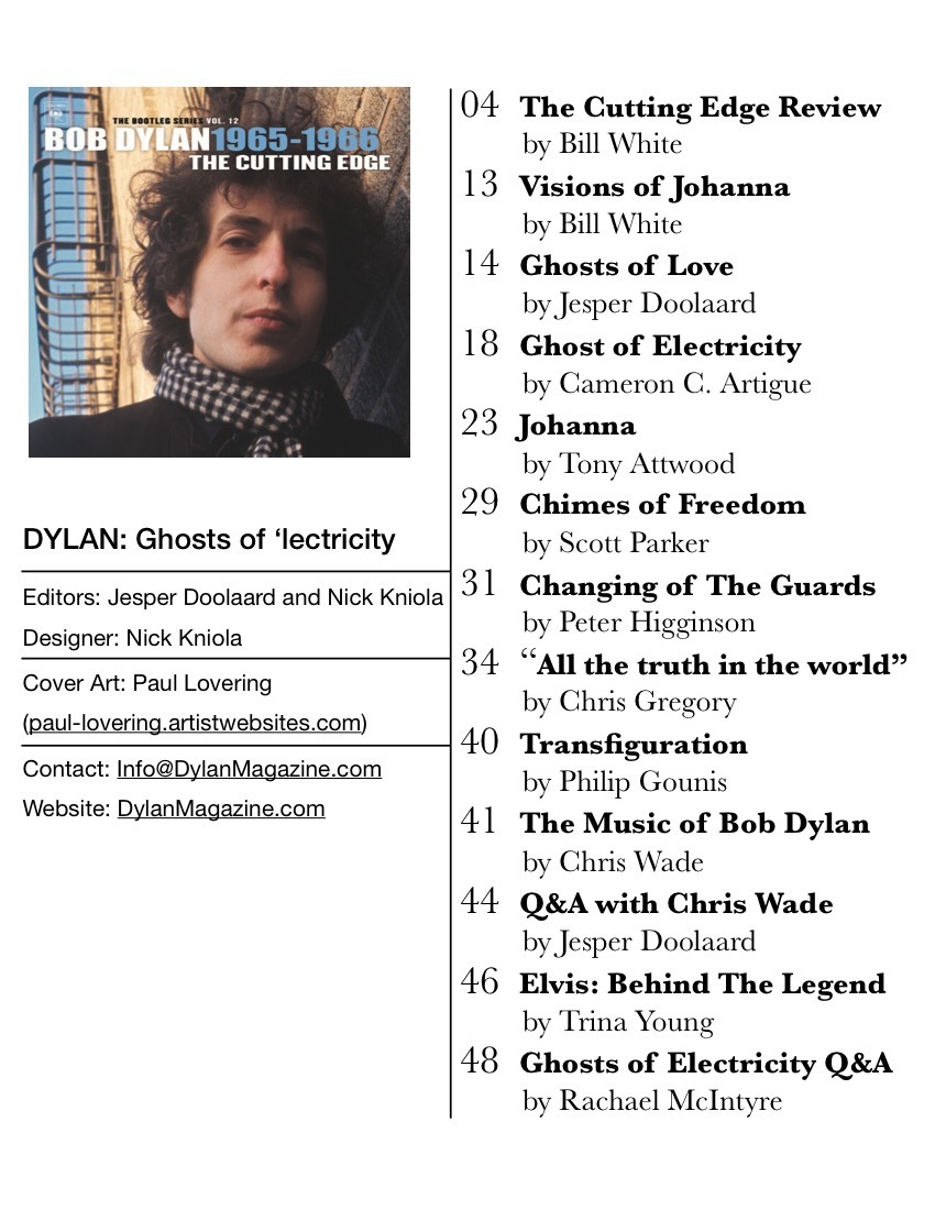 The latest issue of the Bob Dylan magazine DYLAN contains critical articles, book excerpts, and interviews related to the theme "The ghost of 'lectricity." Includes a review of The Cutting Edge, articles inspired by "Visions of Johanna," and several more in almost 50 pages!